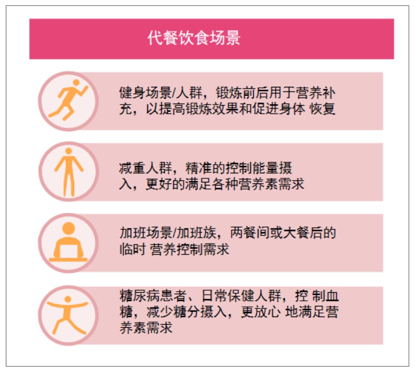 市場(chǎng)將根據(jù)不同的使用場(chǎng)景,進(jìn)行產(chǎn)品細(xì)分:以日常代餐、便捷飽腹為主要目的(如谷物、麥片、餅干零食等);以功能代餐、減肥塑身、抗糖代餐為主要目的(如代餐奶昔粉、斷糖食品等)。