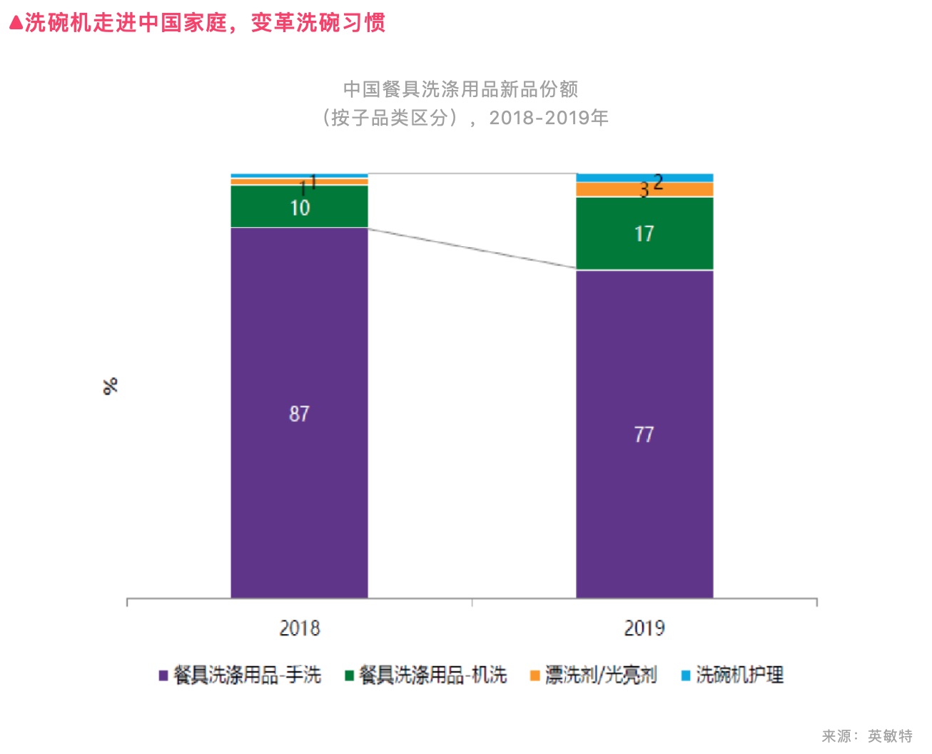 近三年,關于使用方式簡單、體積小功能強的便攜式家電數(shù)碼產(chǎn)品不斷涌現(xiàn),眾多產(chǎn)品實現(xiàn)了可觀的增長,如洗碗機, 增長了67%。由此看出,未來,隨著洗碗機的普及,將帶動餐具清潔產(chǎn)品的銷量增長,產(chǎn)品的類型也越來越多樣化。而香味這一直接的感官體驗,與產(chǎn)品的銷量有著緊密的聯(lián)系,品牌產(chǎn)品不妨在香味上需求突破,讓產(chǎn)品給消費者帶來更愉悅的感官體驗,從而提高產(chǎn)品的溢價力。