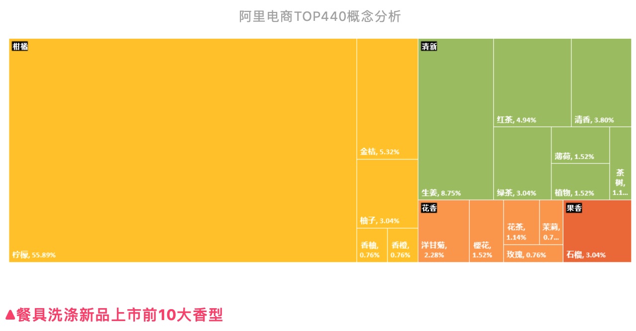 鑒于傳統(tǒng)餐具洗滌品的成分和香味單一特性,從線上數(shù)據(jù)可以推測出主流的香味/成分概念依舊是檸檬、生姜大類。