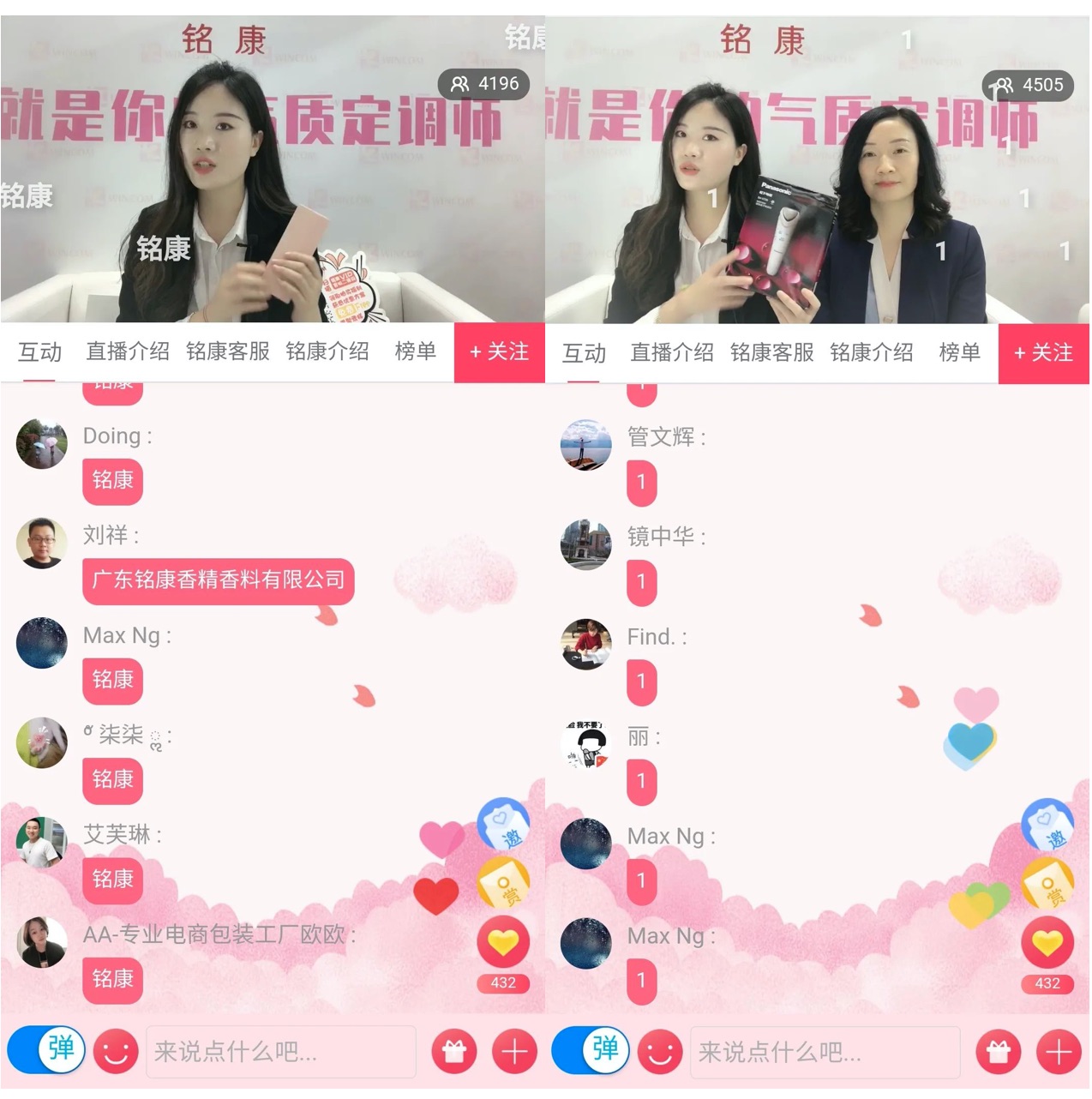 直播開(kāi)始,主持人熱情地介紹本場(chǎng)直播亮點(diǎn)。銘康董事常務(wù)副總余子波先生與主持人帶觀眾云逛五大主題場(chǎng)景,講解五大主題概念;銘康專(zhuān)業(yè)評(píng)香師吳秀女士分享五大主題流行香型,讓觀眾全方面了解銘康最新香型動(dòng)向。
