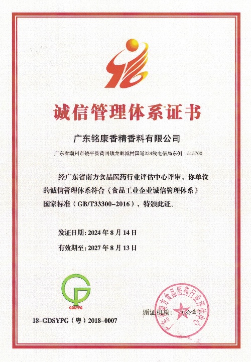 多年來,銘康本著“科學發(fā)展、追求卓越”的企業(yè)宗旨,秉承“攜手共進、誠信共贏”的經(jīng)營理念,歷經(jīng)二十余載的不懈努力,已發(fā)展成為在中國香料香精行業(yè)知名度高、創(chuàng)新能力強、影響力大的品牌企業(yè),歷任“中國香精香料化妝品工業(yè)協(xié)會副理事長單位”、“香精專業(yè)委員會副主任委員單位”、“香料香精法規(guī)事務工作委員會副主任單位”、“科技工作委員會副主任委員單位”,是國家標準《日用香精GB/T22731-2017》主要起草單位,連續(xù)多年被評為中國香精香料行業(yè)十強企業(yè)。